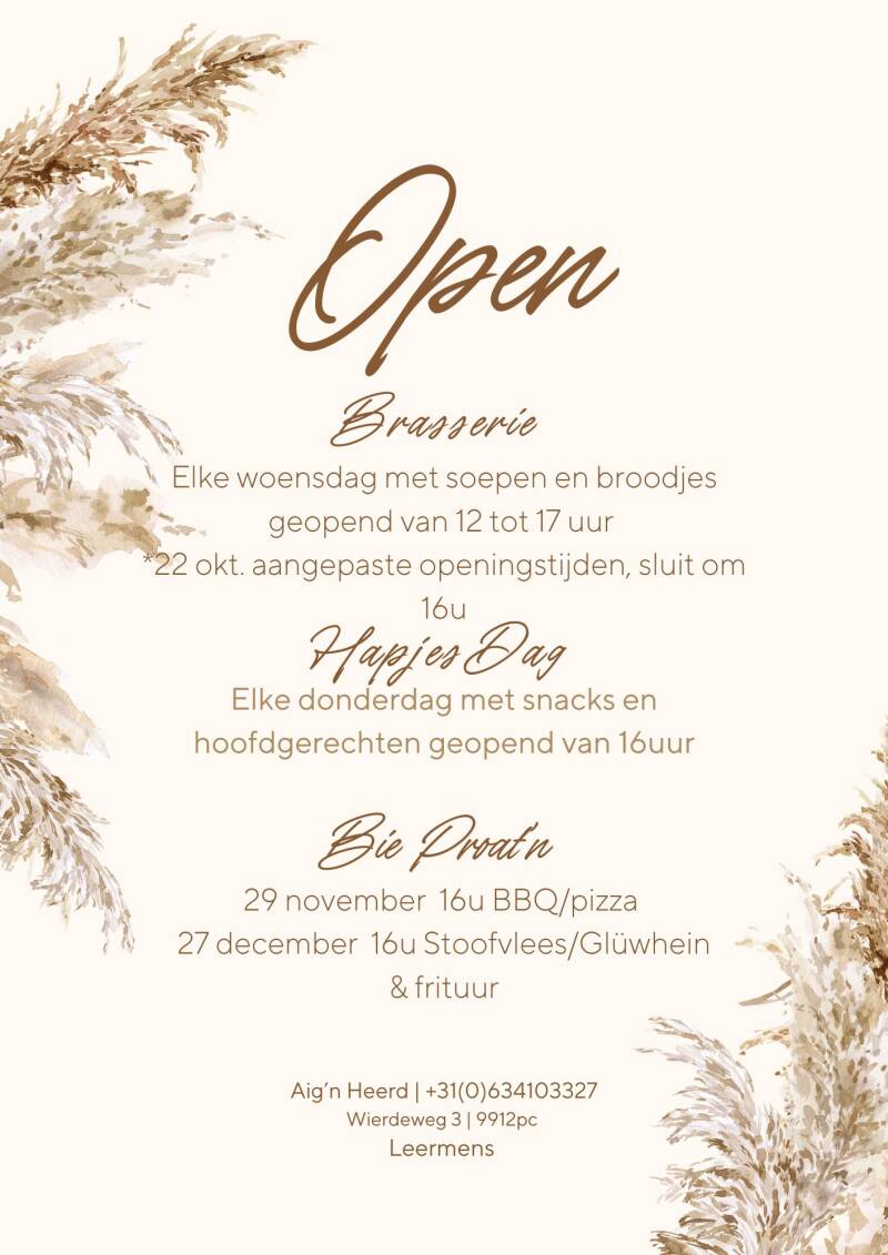 Wij deden onze deuren steeds om 17 uur open maar nu met de kortere dagen willen wij dit toch even veranderen en al om 16 uur open te zijn. Reserveren is niet verplicht maar wel lief. Op is op.